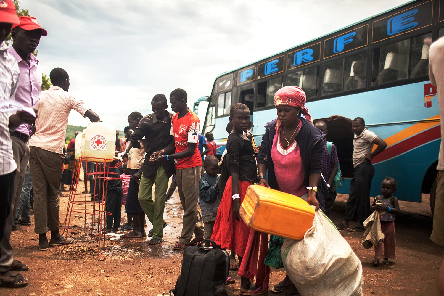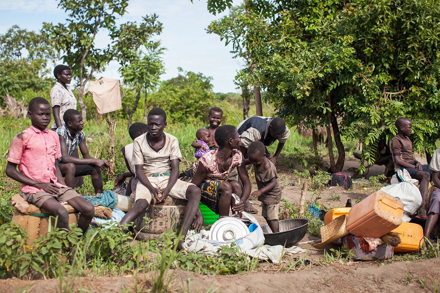 May 2017—South Sudanese refugees wait on the side of the road in northern Uganda, just over the South Sudan border, to be picked up and taken to a registration center to be processed for resettlement in Uganda.