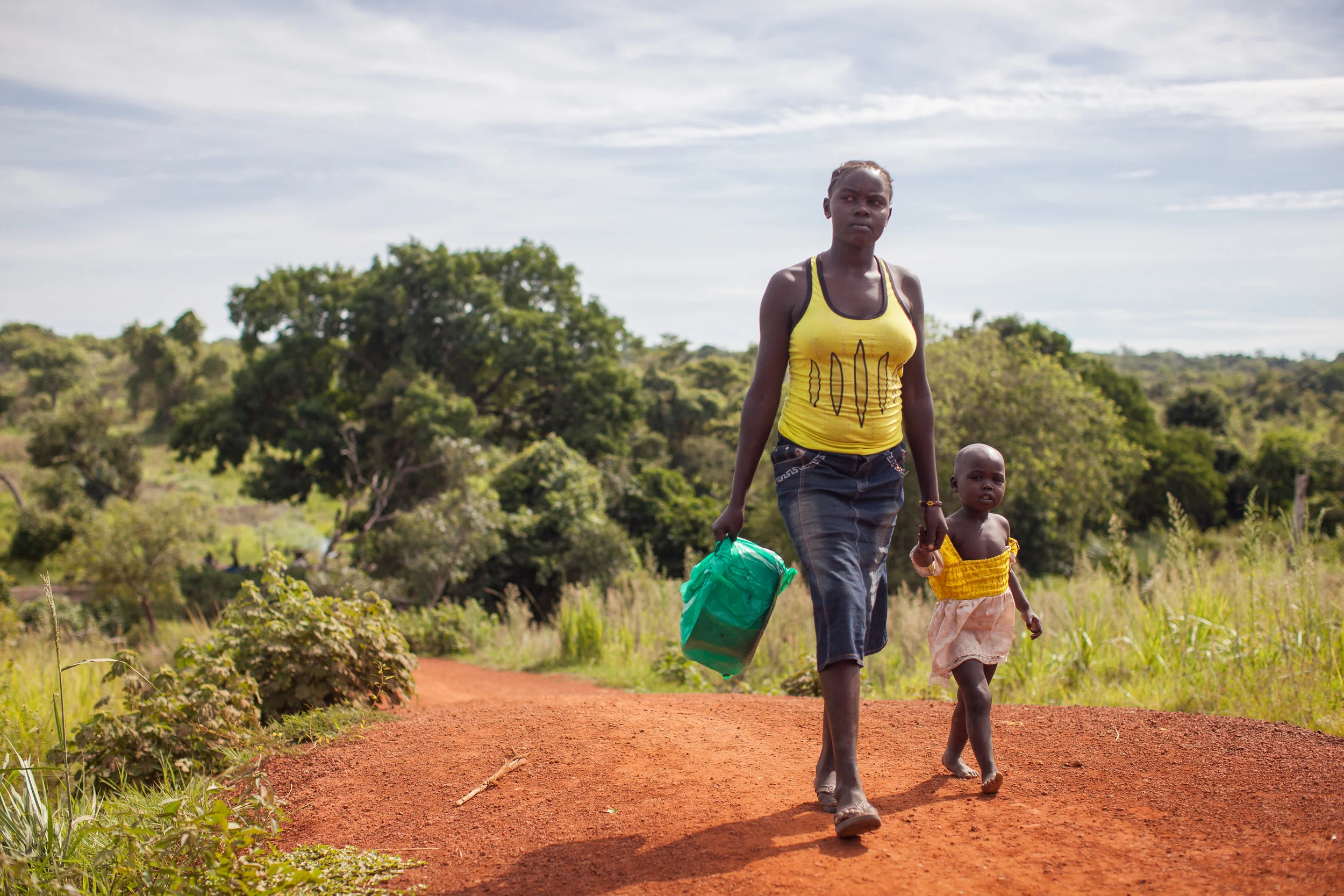 May 2017—A South Sudanese refugee woman and her daughter cross the border from South Sudan to Uganda. South Sudan is caught in an all-out civil war, and more than 900,000 South Sudanese refugees have sought safety across the border in northern Uganda.