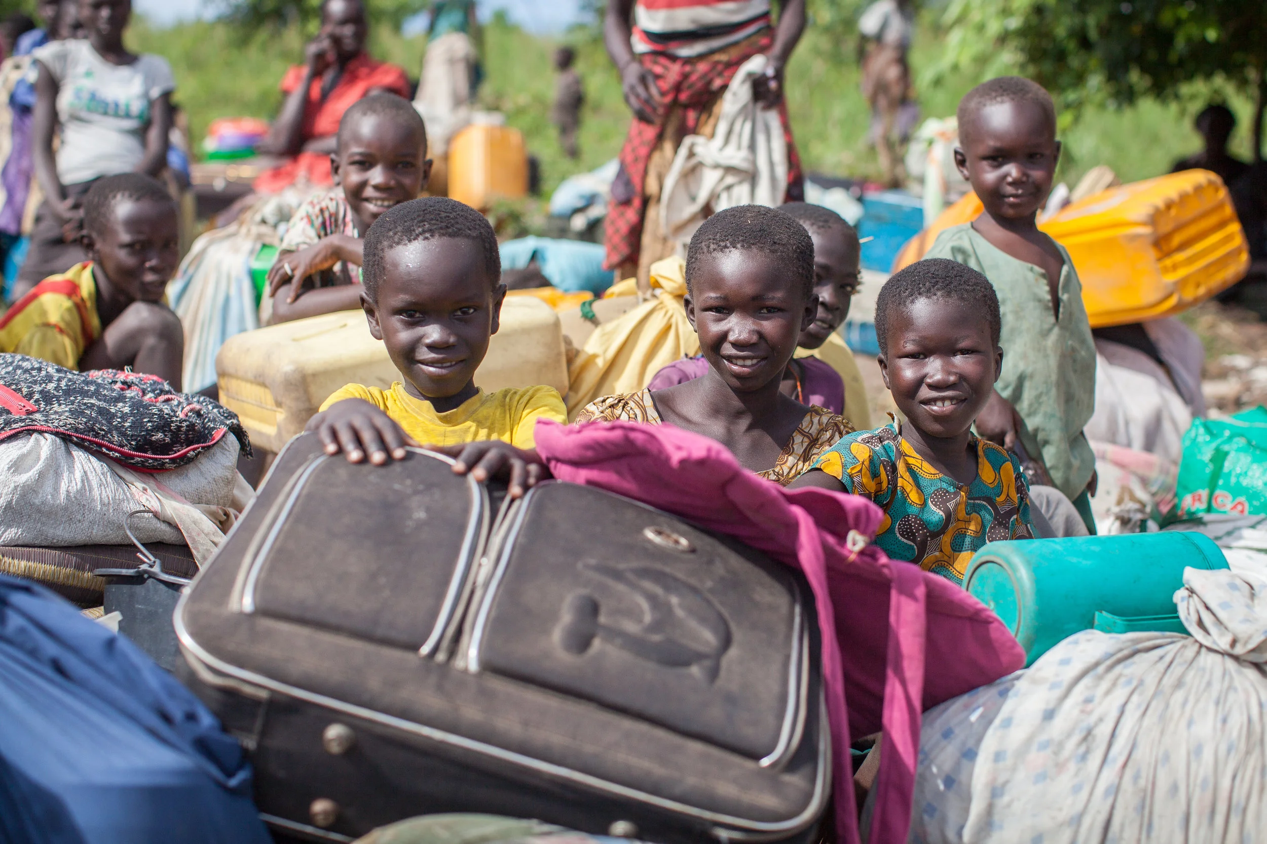 May 2017—South Sudanese refugee children wait with her belongings on the side of the road in northern Uganda, just over the South Sudan border. After crossing the border, refugees wait here to be picked up and driven to a registration center to be processed for resettlement in Uganda.