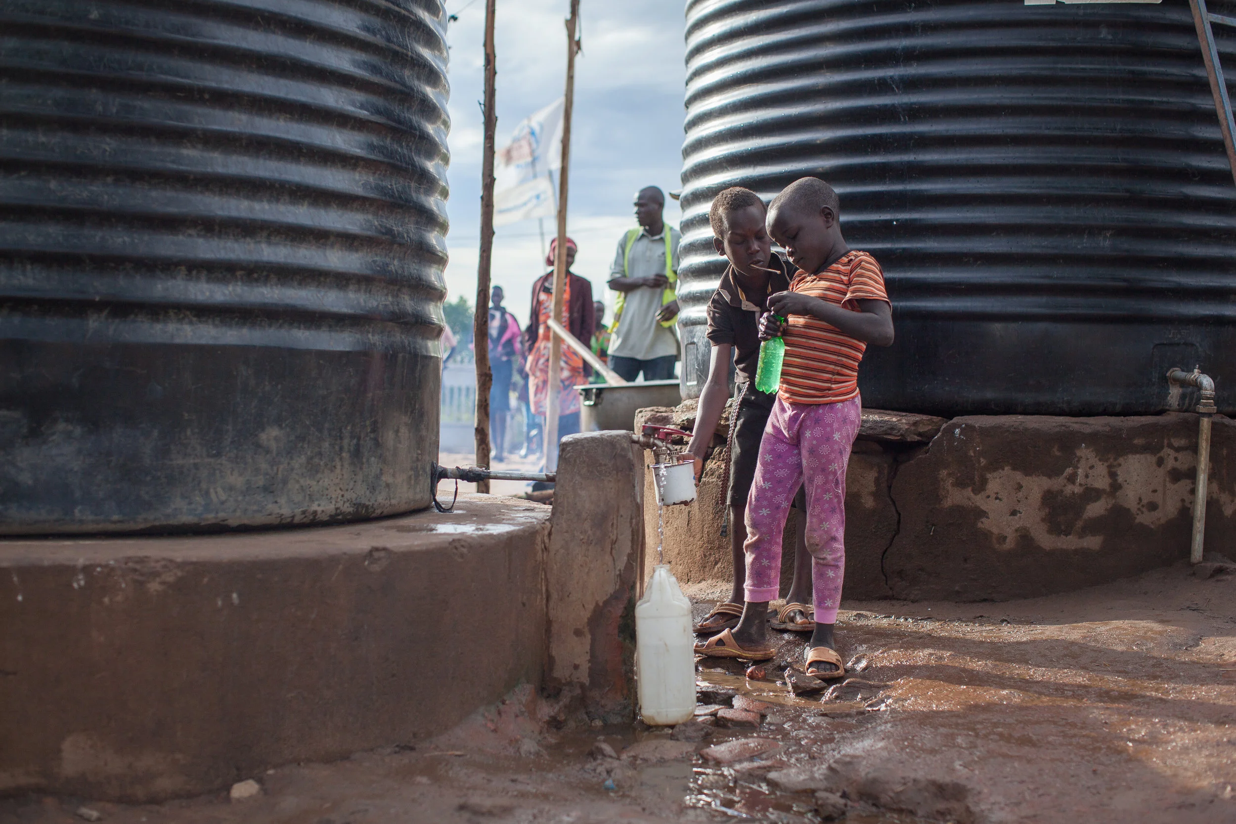 May 2017—Children get water at a Registration Center run by the Office of the Prime Minister and UNHCR in northern Uganda. After South Sudanese refugees cross the border, they are transported here to be registered with the government, and then taken to a settlement where they will build their new home. Refugees are only supposed to be at the registration center for 24-hours, however, the large influx Uganda is receiving (1,000 – 2,000 per day) has led to a wait time of up to five days.