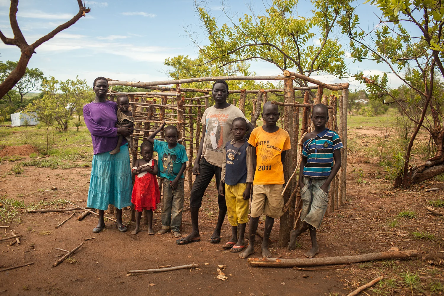 MAY 2017A South Sudanese refugee woman stands with her family in front of the new home she is building at Imvepi Refugee Settlement. After crossing the border from war torn South Sudan and waiting up to a week for their new land, South Sudanese refugees are given a 50 by 50 meter plot of land, and the poles, tarps and tools to build their new homes.