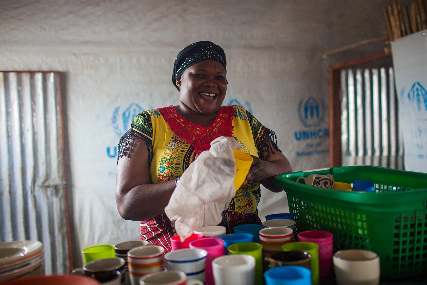 MAY 2017—A Ugandan national, dries dishes at her Quality Restaurant in Bidibidi Settlement in northern Uganda. Bidibidi, opened in August 2016, is host to some 270,000 South Sudanese refugees who fled civil war in South Sudan. A symbol of Uganda’s welcoming policy towards refugees, the woman employs and serves both Ugandans and South Sudanese refugees in her restaurant.