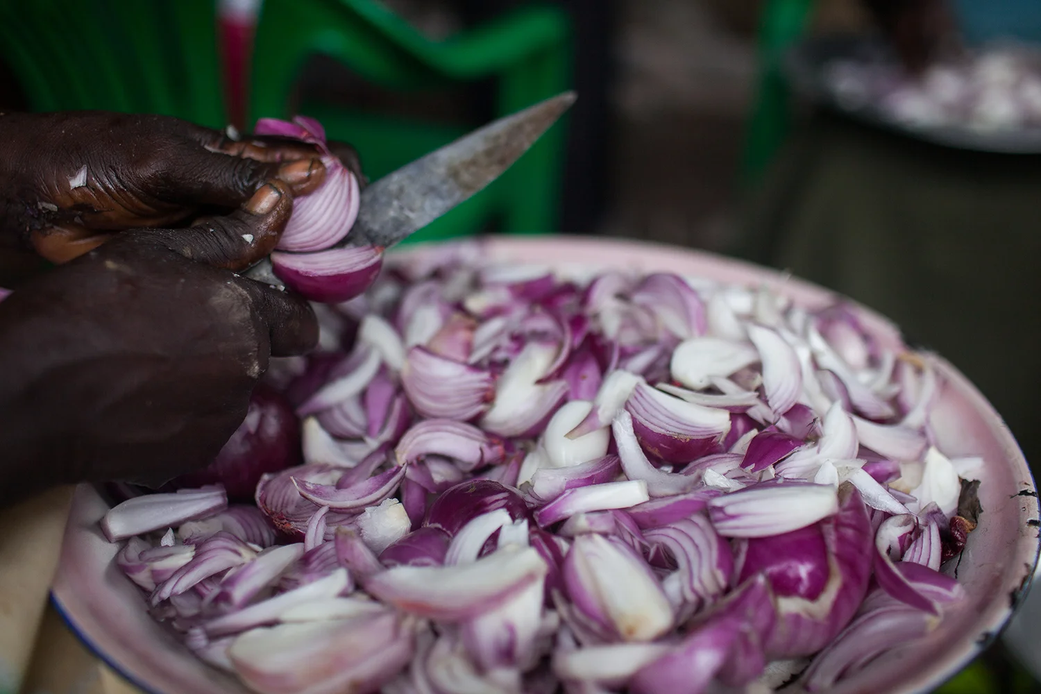 MAY 2017—A woman cuts onions at Quality Restaurant in Bidibidi Settlement in northern Uganda. Bidibidi, opened in August 2016, is host to some 270,000 South Sudanese refugees who fled civil war in South Sudan. A symbol of Uganda’s welcoming policy towards refugees, Quality Restaurant employs and serves both Ugandan nationals and South Sudanese refugees.