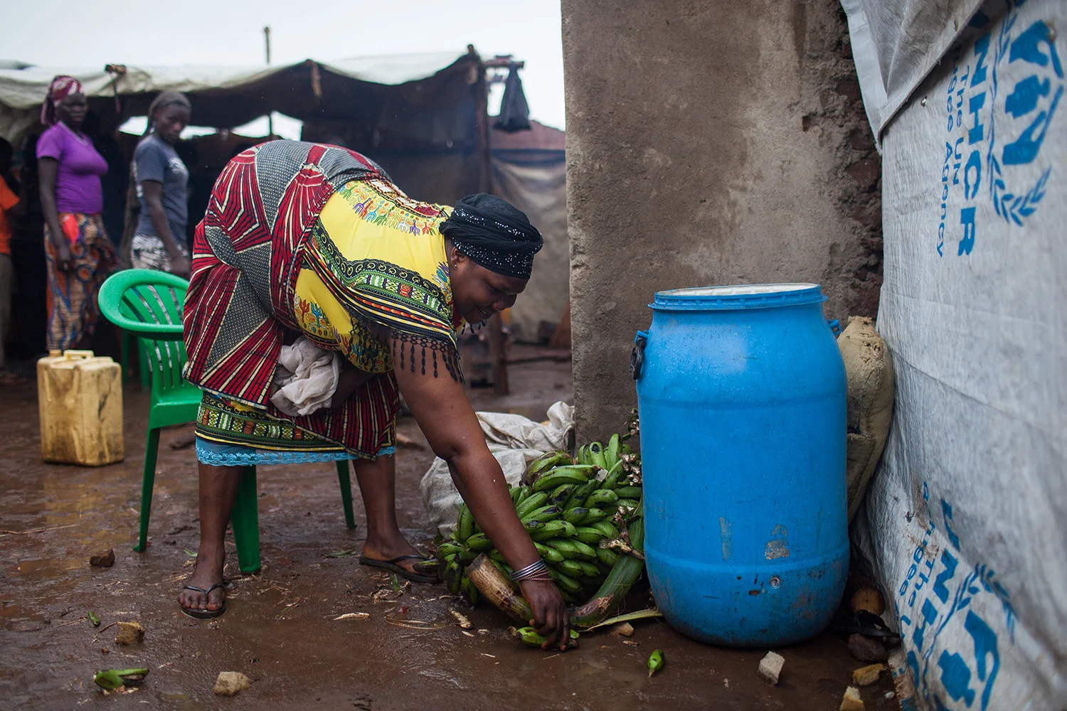 MAY 2017—A Ugandan national, picks up a banana at the restaurant she owns in Bidibidi Settlement in northern Uganda. Bidibidi, opened in August 2016, is host to some 270,000 South Sudanese refugees who fled civil war in South Sudan. A symbol of Uganda’s welcoming policy towards refugees, she employs and serves both Ugandans and South Sudanese refugees in her restaurant.
